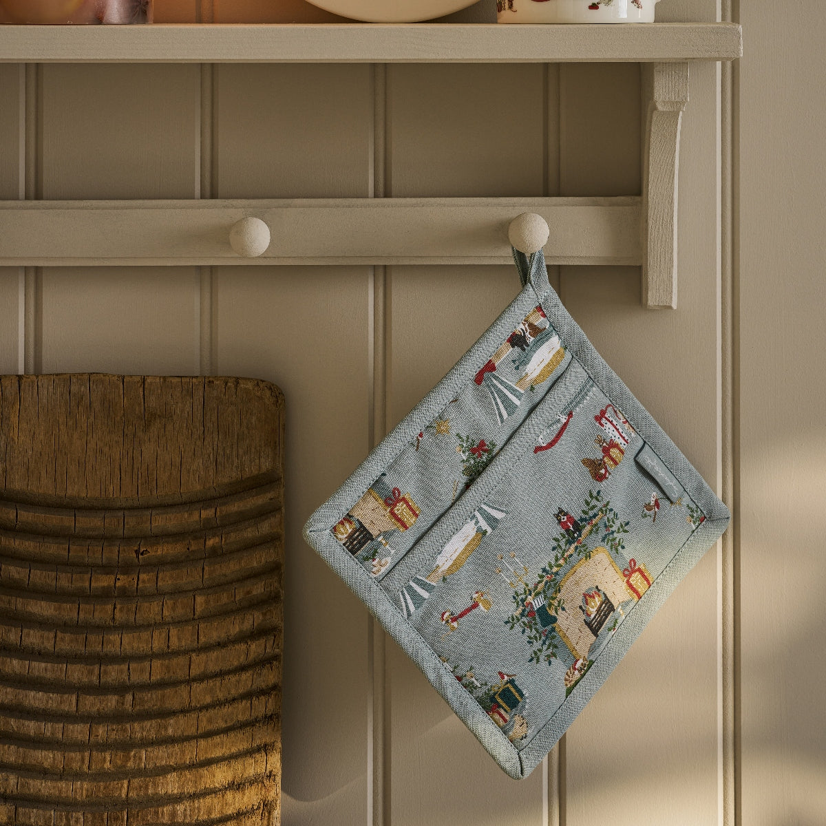 Bring festivities to your kitchen with this pot grab featuring nostalgic Christmas scenes hand-drawn in Sophie's distinctive style. Set against a dusty blue background, the charming illustrations capture the magic of the season. Made from cotton with internal thermal lining for heat protection it's the perfect kitchen accessory to move hot pots and pans around, or serving up Christmas lunch.