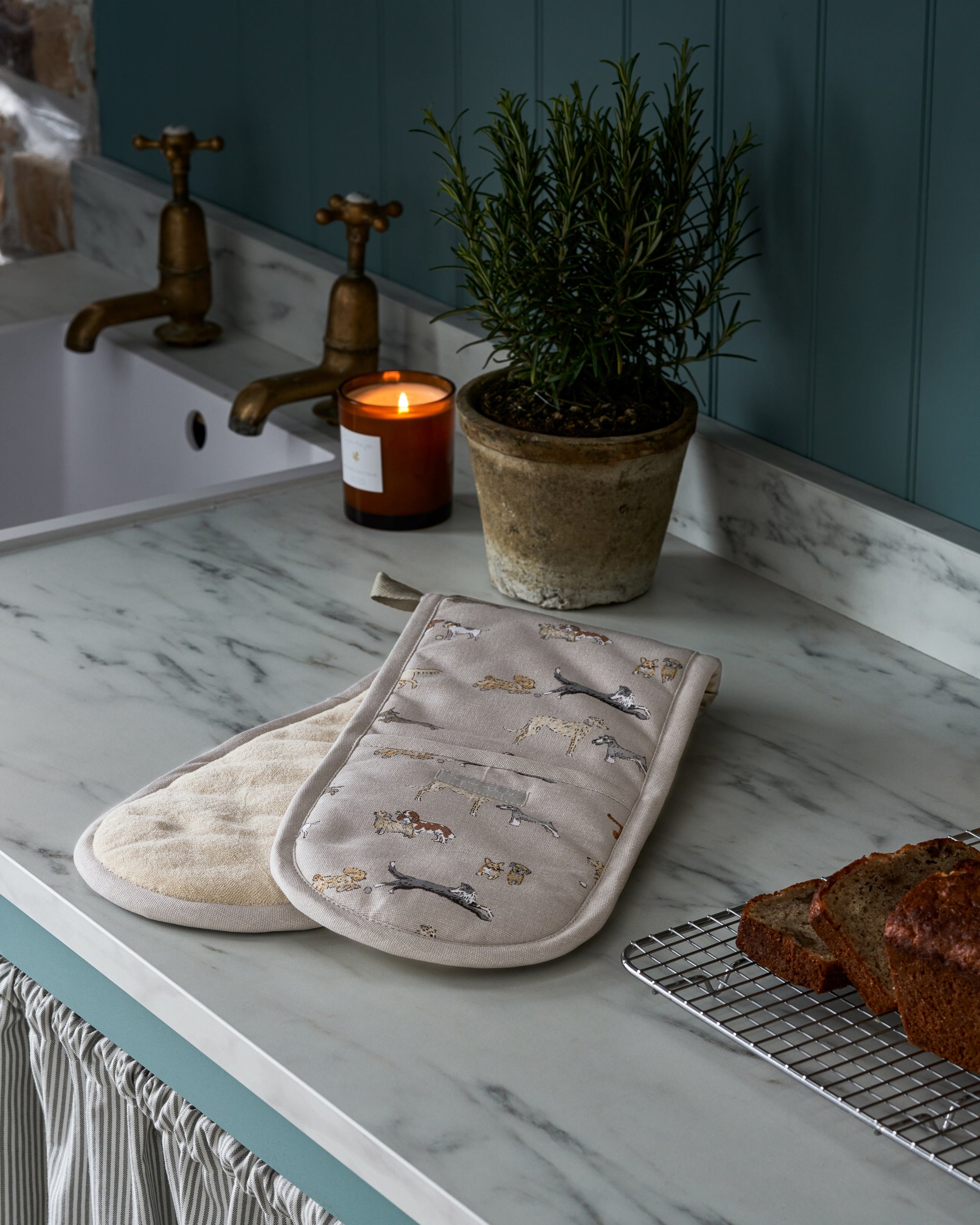 The perfect blend of practicality and charm, these delightful double oven gloves protect your hands from hot baking trays and cookware. Adorned with Sophie's delightful illustrations of playful pups, these double oven gloves bring a touch of whimsy to your cooking routine and kitchen. This sweet design features charming breeds, including border collies, cockapoos, corgis, border terriers, spaniels, king Charles spaniels, schnauzers, golden retrievers, lurchers, wire-haired dachshunds, jack russells and Norfolk terriers.